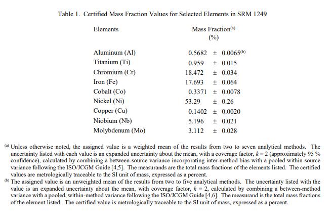 表 1 中提供了選定元素的認(rèn)證質(zhì)量分?jǐn)?shù)值。所有值均以質(zhì)量分?jǐn)?shù)報(bào)告 [1]。 NIST 認(rèn)證值是 NIST 對其準(zhǔn)確性有最高置信度的值,因?yàn)樗幸阎蚩梢傻钠顏碓炊家颜{(diào)查或考慮在內(nèi) [2]。一個(gè)認(rèn)證的值是根據(jù) NIST 和合作實(shí)驗(yàn)室使用表 4 中列出的測試方法進(jìn)行的分析結(jié)果對真實(shí)值的當(dāng)前最佳估計(jì)值。與值一起列出的不確定度是擴(kuò)展不確定度(95 % 置信度)[3],根據(jù)計(jì)算得出ISO/JCGM 指南 [4] 中的方法。