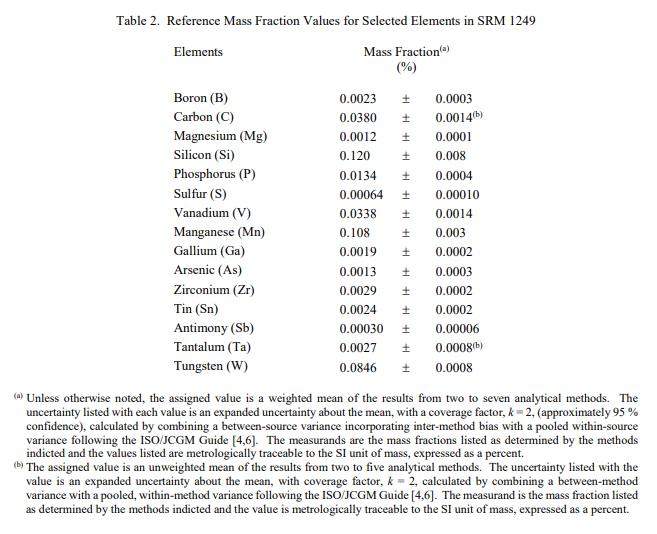 選定元素的參考質(zhì)量分?jǐn)?shù)值列于表 2。參考值是非認(rèn)證值,是當(dāng)前對真實(shí)值的最佳估計(jì);但是,這些值不符合 NIST 認(rèn)證標(biāo)準(zhǔn),并且提供了相關(guān)的不確定性,可能不包括所有不確定性來源。隨數(shù)值列出的不確定度是根據(jù) ISO/JCGM 指南 [4] 中的方法計(jì)算得出的擴(kuò)展不確定度(95% 置信度)[3]。