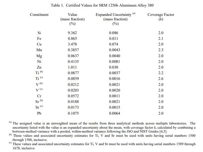 NIST 認證值是 NIST 對其準確性有最高置信度的值,因為 NIST 已調查或說明了所有已知或可疑的偏差來源。認證值是根據 NIST 和合作實驗室使用表 3 中列出的測試方法進行的分析結果對真實值的當前最佳估計值。與值一起列出的不確定度是基于 95% 置信區間的擴展不確定度[3] 并根據 ISO 和 NIST 指南 [4] 中的方法計算。