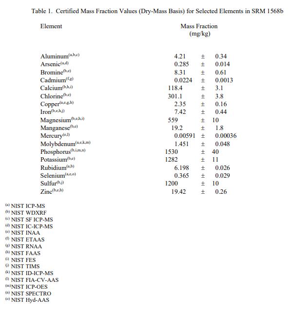 表 1 和表 2 中提供了 SRM 1568b 中選定元素的認證質量分數值。 NIST 認證值是 NIST 對其準確性的最高置信度值,因為所有已知或可疑的偏差來源已被調查或考慮[1]。 NIST 和日本國家計量研究所 (NMIJ) 進行了賦值分析。以質量分數單位 [2] 以干質量為基礎報告值。