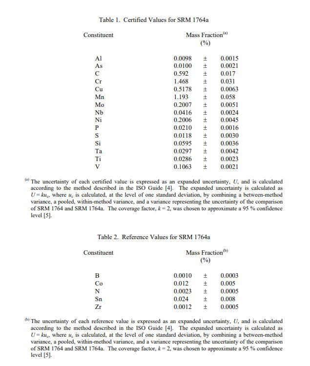 NIST SRM 1764 a 低合金鋼(標準品) 的認證在規定的不確定性范圍內無限期有效,前提是按照本證書中給出的說明處理和存儲 SRM(請參閱使用說明)。但是,如果 SRM 損壞、污染或以其他方式修改,則認證將失效。