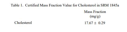 表 1 至表 3 提供了 SRM 1845a 中膽固醇、元素和維生素的認證質量分數值,按原樣報告,在表 1 至 3 中提供。NIST 認證值是 NIST 具有最高置信度的值其準確性在于所有已知或可疑的偏差和可變性來源已考慮[1]。價值分配分析由 NIST 和合作實驗室進行。認證值計算為 NIST 方法的平均值和合作實驗室提供的結果平均值的中位數或平均值(如果適用)。相關的不確定性以大約 95% 的置信水平表示 [2-4]。