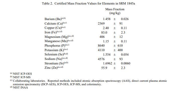 表 4 至 8 提供了 SRM 1845a 中其他分析物的參考質量分數值,按原樣報告。NIST 參考值是非認證值,是基于真實值的最佳估計關于可用數據;但是,該值不符合 NIST 標準認證 [1] 并提供相關的不確定性,這些不確定性可能僅反映測量再現性,可能不包括所有不確定性來源,或者可能反映多種分析方法之間缺乏足夠的統計一致性。參考質量分數值來自 NIST 和/或合作實驗室報告的結果。