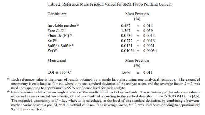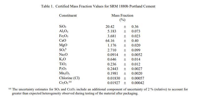 SRM 1880b 中成分的認證值在表 1 中以質量分數 [1] 的形式在收到時報告。 NIST 認證值是 NIST 對其準確性具有最高置信度的值,因為所有已知或可疑的偏差來源都已被調查或考慮在內 [2]。認證值是根據 NIST 和合作實驗室使用附錄中列出的儀器和經典測試方法進行的分析結果對真實值的當前最佳估計。