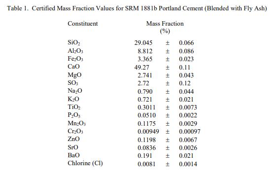 SRM 1881b 成分的認(rèn)證值在表 1 中報告為質(zhì)量分?jǐn)?shù) [1]。 NIST 認(rèn)證值是 NIST 對其準(zhǔn)確性具有最高置信度的值,因為所有已知或可疑的偏差來源都已被調(diào)查或考慮在內(nèi) [2]。認(rèn)證值是存在的真實值的最佳估計。