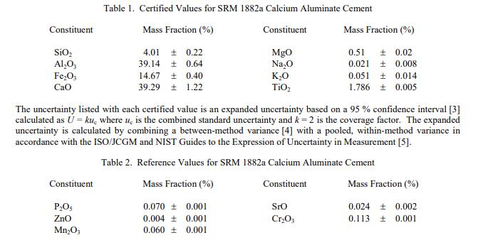 表 1 中提供了八種元素的認(rèn)證值,以氧化物形式表示為質(zhì)量分?jǐn)?shù) [1],在收到的基礎(chǔ)上。NIST 認(rèn)證值是 NIST 對其最有信心的值。準(zhǔn)確性,因為所有已知或可疑的偏差來源都已被調(diào)查或考慮帳戶。列出的認(rèn)證值基于 NIST 和 Construction Technology Laboratories, Inc. (CTL) 使用 X 射線熒光光譜法、原子吸收光譜法和 ASTM C 114-97 標(biāo)準(zhǔn)測試方法中給出的參考方法進(jìn)行的分析結(jié)果液壓化學(xué)分析水泥 [2]。使用 X 射線熒光光譜法進(jìn)行均勻性測試。