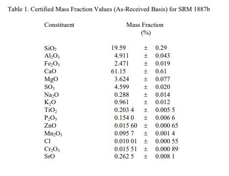 SRM 1887b 成分的認(rèn)證值在表 1 中報(bào)告為收到時(shí)的質(zhì)量分?jǐn)?shù) [1]。 NIST 認(rèn)證值是 NIST 對(duì)其準(zhǔn)確性具有最高置信度的值,因?yàn)樗幸阎蚩梢傻钠顏?lái)源都已被調(diào)查或考慮在內(nèi) [2]。一個(gè)認(rèn)證值是根據(jù) NIST 和合作實(shí)驗(yàn)室使用附錄 A 中列出的儀器和經(jīng)典測(cè)試方法進(jìn)行的分析結(jié)果對(duì)真實(shí)值的當(dāng)前最佳估計(jì)。