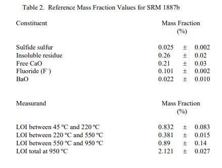 NIST SRM 1887b 硅酸鹽水泥(標(biāo)準(zhǔn)品)表 2 中報(bào)告了成分和燒失量 (LOI) 的參考值。NIST 參考值是未經(jīng)認(rèn)證的值,它是基于可用數(shù)據(jù)對(duì)真實(shí)值的最佳估計(jì);然而,該值不符合 NIST 的認(rèn)證標(biāo)準(zhǔn),并且提供了相關(guān)的不確定性,這些不確定性可能僅反映測(cè)量再現(xiàn)性,可能不包括所有不確定性來(lái)源,或者可能反映多種分析方法之間缺乏足夠的統(tǒng)計(jì)一致性 [2]。