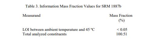 表 3 中報(bào)告了環(huán)境溫度和 45 oC 之間的 LOI 信息值和總分析成分。信息值被認(rèn)為是 SRM 用戶(hù)可能感興趣的值,但沒(méi)有足夠的信息可用于評(píng)估與值相關(guān)的不確定性 [2]。