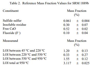 表 2 中報告了成分和燒失量 (LOI) 的參考值。NIST 參考值是未經(jīng)認(rèn)證的值,是基于可用數(shù)據(jù)對真實值的當(dāng)前最佳估計;但是,該值不符合 NIST 認(rèn)證標(biāo)準(zhǔn),并提供了相關(guān)的可能僅反映測量重現(xiàn)性的不確定性,可能不包括所有不確定性來源,或可能反映多種分析方法之間缺乏足夠的統(tǒng)計一致性 [2]。