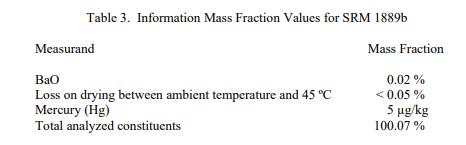 表 3 中報告了成分的信息值、環(huán)境溫度和 45 oC 之間的 LOI 以及總分析成分的信息值。信息值被認(rèn)為是 SRM 用戶可能感興趣的值,但沒有足夠的信息來評估與值相關(guān)的不確定性 [2]。信息值不能用于建立計量溯源性。