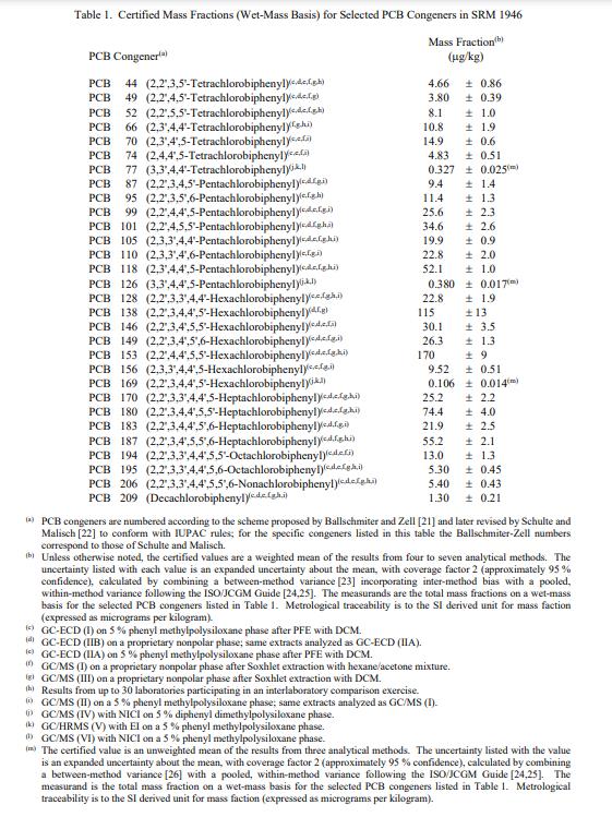 表 1、2 和 3 中提供了選定 PCB 同系物、氯化農藥和 PBDE 同系物的認證質量分數值。 PCB、氯化農藥和 PBDE 的認證值基于從兩種或多種獨立分析技術獲得的結果。認證值是表 4 中提供了可提取脂肪和單個脂肪酸。脂肪和脂肪酸的認證值基于 NIST 和合作實驗室進行的測量。表 5 提供了甲基汞、總汞、砷和鐵的認證值。甲基汞和這些元素的認證值基于 NIST 和合作實驗室進行的兩種或多種獨立分析技術的結果。 NIST 認證值是 NIST 對其準確性有最高置信度的值,因為所有已知或可疑的偏差來源都已被調查或考慮 [1]。