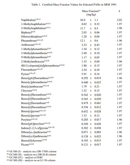 表 1 中提供了 PAH 的認證質量分數值。 NIST 認證值是 NIST 對其準確性的最高置信度的值,因為所有已知或可疑的不確定性來源都已調查或考慮在內[2]。認證值基于 NIST 和北達科他大學(北達科他州大福克斯)能源與環境研究中心 (EERC) 使用多種分析技術獲得的結果一致。