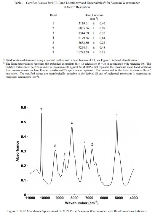 NIST 認證值是 NIST 對其準確性有最高置信度的值,因為所有已知或可疑的偏差來源都已調查或考慮在內。在本證書中,如果光譜特征的位置由重心 (COG) 或質心算法確定,則將其稱為波段,而由五點三次多項式擬合確定的光譜特征稱為峰位置。 SRM 2035b 已通過認證7 個波段的 10 % 波段分數質心,光譜范圍從 10 300 cm-1 到 5 100 cm-1,分辨率為 8 cm-1(真空波數)。在 1 nm 和 3 nm 光譜帶寬(空氣波長)下,相同的七個波段在 971 nm 至 1960 nm 光譜范圍內的 10% 波段分數質心位置得到認證。這七個波段的認證吸收波段位置在表 1 中給出了真空波數,表 2 中給出了空氣波長。 SRM 2035b 經認證可在 1 nm 和 3 nm 光譜帶寬的 334 nm 至 805 nm 光譜范圍內增加 13 個峰值位置。表 3 中給出了空氣波長的這 13 個峰的經認證的透射率峰位置。