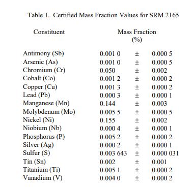 SRM 2165 的 16 種成分的認證值在表 1 中報告為質量分數 [1]。 NIST 認證值是 NIST 對其準確性具有最高置信度的值,因為所有已知或可疑的偏差來源都已被調查或考慮在內 [2]。認證值是存在的根據 NIST 和合作實驗室使用表 4 中所示的測試方法進行的分析結果對真實值的最佳估計。