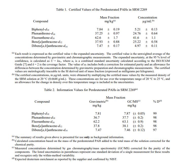 表 1 中給出了五種過氘化 PAH 的認證濃度值。這些值基于從該溶液的重量法制備和使用氣相色譜法測定的分析結果獲得的結果。 NIST 認證值是