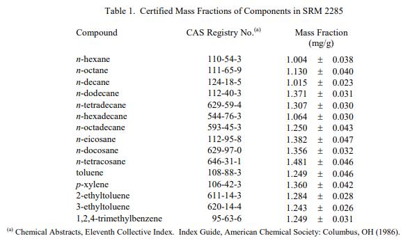 表 2 中提供了組分的濃度信息值,以體積分數百分比表示。信息值被認為是 SRM 用戶感興趣和使用的值,但沒有足夠的信息來充分評估與該值相關的不確定性,或者只進行了有限數量的分析 [1]。