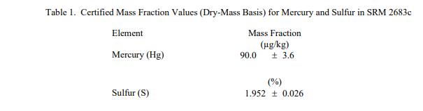 表 1 中提供了汞和硫的認(rèn)證值,以基于干質(zhì)量的質(zhì)量分?jǐn)?shù) [1] 表示。汞認(rèn)證值基于或直接溯源到單一 NIST 主要方法。 NIST 認(rèn)證值是 NIST 對(duì)其準(zhǔn)確性具有最高置信度的值,因?yàn)樗幸阎蚩梢傻钠顏碓炊家驯徽{(diào)查或考慮在內(nèi) [2]。