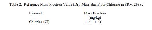 表 2 中提供了氯的參考值,表示為基于干質(zhì)量的質(zhì)量分?jǐn)?shù) [1]。參考值是非認(rèn)證值,是對(duì)真實(shí)值的最佳估計(jì);但是,該值不符合 NIST 的認(rèn)證標(biāo)準(zhǔn),并且提供了相關(guān)的不確定性,該不確定性可能僅反映測(cè)量精度,可能不包括所有不確定性來源 [2]。