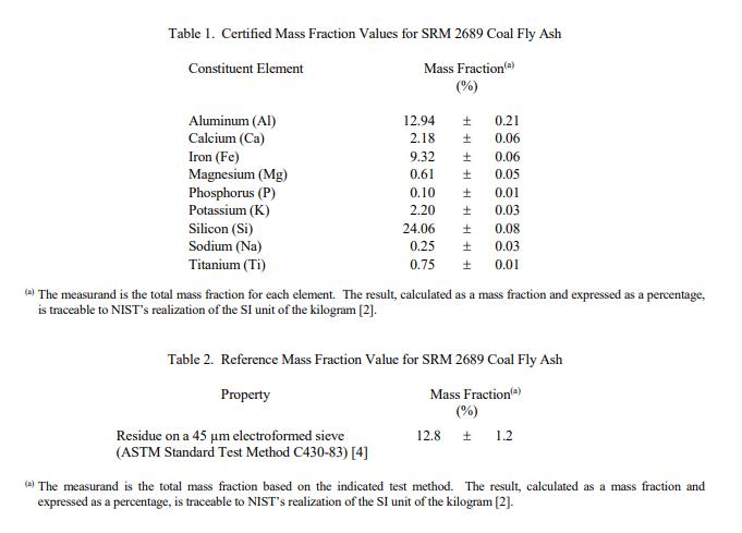 主要和次要組成元素的認證值在表 1 中提供。NIST 認證值是 NIST 對其準確性有最高置信度的值,因為所有已知或可疑的偏差來源都已調查或考慮到[1]。不確定性表示為認證值所基于的方法中未加權平均值的兩個標準差。值以質量分數單位 [2] 以原樣(非干質量)為基礎報告。