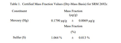 表 1 中提供了硫和汞的認證值,以基于干質量的質量分數 [1] 表示。NIST 認證值是 NIST 對其準確性有最高置信度的值所有已知或可疑的偏差來源都已被調查或考慮 [2]。認證值是對真實值的當前最佳估計。硫的認證值基于加權最小