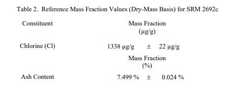 NIST SRM 2692c煙煤(標準品)表 2 中提供了氯和灰分含量 [6,7] 的參考值,以基于干質量的質量分數 [1] 表示。氯的參考值基于使用NIST 技術。灰分含量的參考值基于 CANSPEX 計劃與 NIST 合作提供的數據。參考值是非認證值,是對真實值的當前最佳估計;但是,這些值不符合 NIST 的認證標準,并且提供了相關的不確定性,這些不確定性可能僅反映測量精度,可能不包括所有不確定性來源 [2]。每個值列出的不確定度是基于 95% 置信區間的擴展不確定度,并根據ISO/JCGM 指南 [4,5] 中的方法。