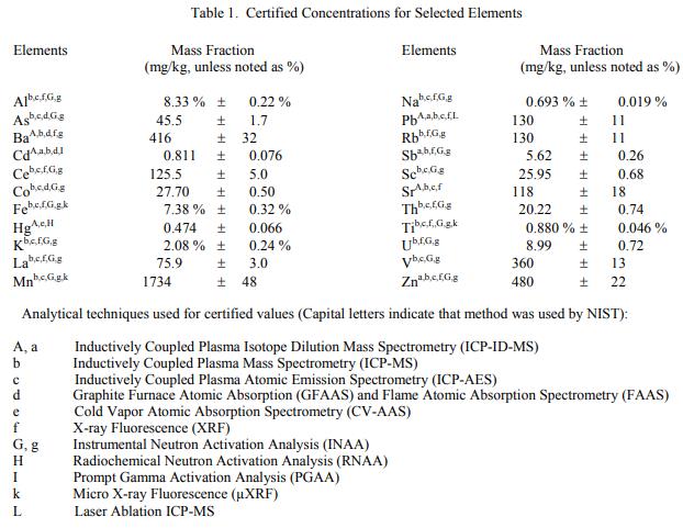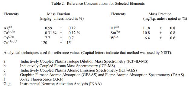 認(rèn)證值基于 NIST 和合作專家實驗室 [1] 獲得的兩種或多種化學(xué)獨立分析技術(shù)的結(jié)果一致。表 1 提供了 22 種元素的濃度認(rèn)證值,以質(zhì)量分?jǐn)?shù)表示。