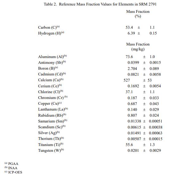 表 2 和表 3 中提供了其他元素的參考質量分數值,以干質量為基礎報告,以及 SRM 2791 中的灰分。NIST 參考質量分數值是最佳估計值的非認證值基于可用數據的真實值;但是,這些值不符合 NIST認證標準 [1] 提供的不確定度可能僅反映測量再現性,可能不包括所有不確定性來源,或者可能反映多種分析方法之間缺乏足夠的統計一致性。參考質量分數值來自 NIST 報告的結果。
