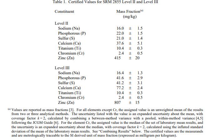 表 1 報(bào)告了 SRM 2855 II 級(jí)和 III 級(jí)成分的認(rèn)證值。賦值類別基于 NIST 用于化學(xué)參考材料的術(shù)語(yǔ)和模式的定義 [1]。 NIST 認(rèn)證值是 NIST 對(duì)其準(zhǔn)確性有最高置信度的值,因?yàn)樗幸阎蚩梢傻钠顏?lái)源都已被調(diào)查或考慮在內(nèi)。認(rèn)證值根據(jù) NIST 和合作實(shí)驗(yàn)室使用儀器測(cè)試方法進(jìn)行的分析結(jié)果,提供對(duì)真實(shí)值的最佳估計(jì)。