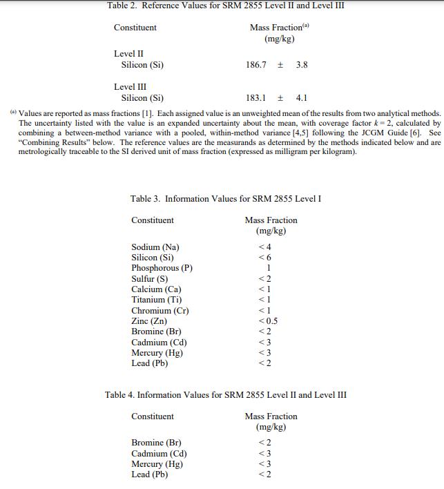 表 3 中報(bào)告了 SRM 2855 Level I 中成分的信息值。表 4 中報(bào)告了 SRM 2855 Level II 和 Level III 的信息值。信息值被認(rèn)為是感興趣的值給 SRM 用戶,但沒(méi)有足夠的信息來(lái)評(píng)估與值相關(guān)的不確定性 [1]。信息值不能用于建立計(jì)量溯源性。
