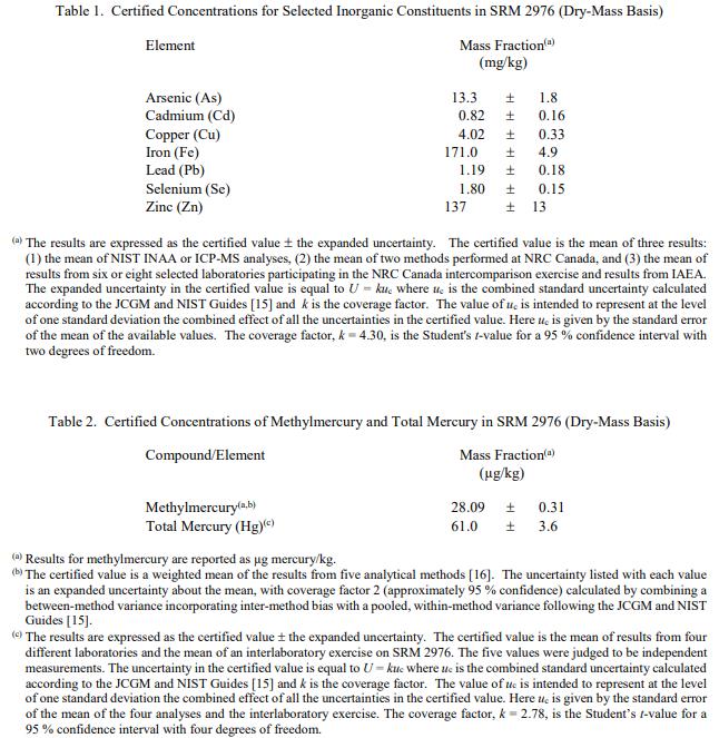 認證濃度值:表 1 和表 2 中提供了以質量分數表示的八種微量元素和甲基汞濃度的認證值。 NIST 認證值是 NIST 對其準確性有最高信心的值,因為 NIST 已調查或解釋了所有已知或可疑的偏差來源。這些成分的認證值基于 NIST 和其他合作實驗室使用兩種或多種獨立分析技術獲得的結果的一致性。被測量是表 1 和表 2 中列出的每種成分的總質量分數。認證值在計量上可追溯到 SI 衍生的質量分數單位,以百分比表示。