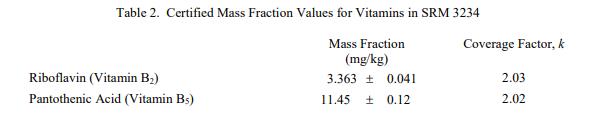 表 1 和表 2 提供了 SRM 3234 中元素和維生素的認證質量分數值,以干質量為基礎報告。NIST 認證值是 NIST 對其準確性有最高置信度的值因為所有已知或可疑的偏見來源都已被調查或考慮 [1]。價值分配分析由 NIST 和合作實驗室進行。認證值計算為 NIST 方法的平均值和合作實驗室提供的平均結果的中位數(在適當的情況下)。所有值在沒有加權的情況下合并。相關的不確定性以大約 95% 的置信水平表示 [2-4]。