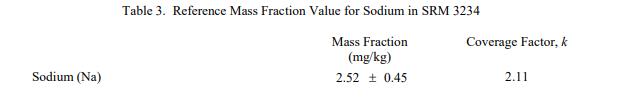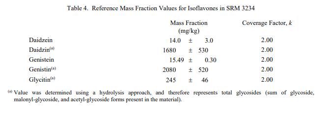 表 3 到表 6 提供了 SRM 3234 中鈉、異黃酮、近似物、總膳食纖維、卡路里和氨基酸的參考質量分數值,以干質量為基礎報告。NIST 參考值是未經認證的值,它是基于可用數據對真實值的最佳估計;但是,該值不符合 NIST 認證標準 [1],并且提供的不確定度可能僅反映測量再現性,可能不包括所有不確定性來源,或者可能反映多種分析方法之間缺乏足夠的統計一致性。參考質量分數值來自 NIST 或合作實驗室報告的結果。