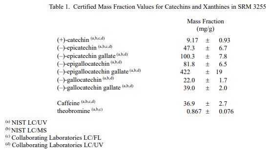 表 1 和表 2 提供了 SRM 3255 中兒茶素、黃嘌.呤和元素的認證質量分數值,以干質量為基礎報告。NIST 認證值是 NIST 具有最高置信度的值在其準確性方面,所有已知或可疑的偏差來源都已被調查或考慮 [1]。價值分配分析由 NIST 和合作實驗室進行。兒茶素和黃嘌.呤的認證值是各組結果的同等加權平均值;元素的認證值計算為 NIST 方法的平均值的平均值和合作實驗室提供的結果平均值的中位數(如果適用)。相關的不確定性以大約 95% 的置信水平表示 [2-4]。