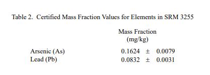 水分測定:SRM 3255 的水分含量在 NIST 通過 (1) 在 7 天內冷凍干燥至恒重進行測定; (2) 用高氯酸鎂在干燥器中室溫干燥28 d; (3) 在 80 ℃的強制通風烘箱中干燥 2 h。對使用所有三種技術獲得的未加權結果進行平均,以確定 (0.9687 ± 0.0055) 克干質量/克原樣質量的轉換因子,用于將數據從原樣轉換為干質量;此值上顯示的不確定性是擴展的不確定性 (k = 2),代表 95% 的置信水平。從水分測量中獲得的轉換因子 (0.28 %) 的不確定度部分包含在認證值和參考值的不確定度中,以干質量為基礎報告,在本證書中提供。