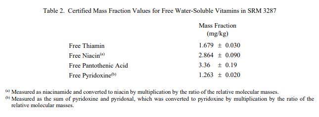 表 1 至表 3 提供了 SRM 3287 中奎尼酸、游離水溶性維生素和元素的認證質量分數值,以干質量為基礎報告。NIST 認證值是NIST 對其準確性的信心最高,因為所有已知或可疑的偏差來源都已考慮在內 [1]。價值分配分析由 NIST 和合作實驗室進行。