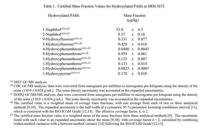 NIST SRM 3672 吸煙者尿液中有機(jī)污染物表 1 中提供了羥基化 PAH 的認(rèn)證質(zhì)量分?jǐn)?shù)值。 NIST 認(rèn)證值是 NIST 對(duì)其準(zhǔn)確性具有最高置信度的值,因?yàn)樗幸阎蚩梢傻牟淮_定性來(lái)源都已被調(diào)查或考慮在內(nèi)帳戶 [1]。認(rèn)證值基于 NIST、CDC 和魁北克國(guó)家公共衛(wèi)生研究所 (INSPQ) 獲得的結(jié)果一致。