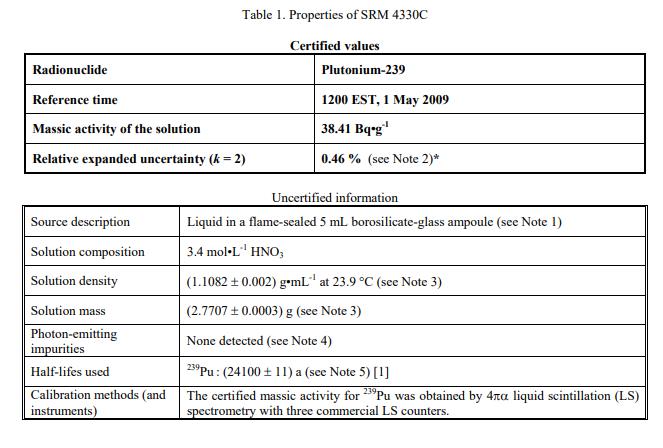 標準參考物質 NIST SRM 4330C - 钚-239放射性標準